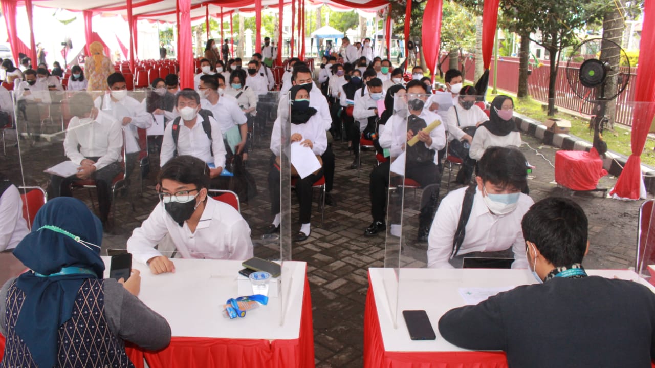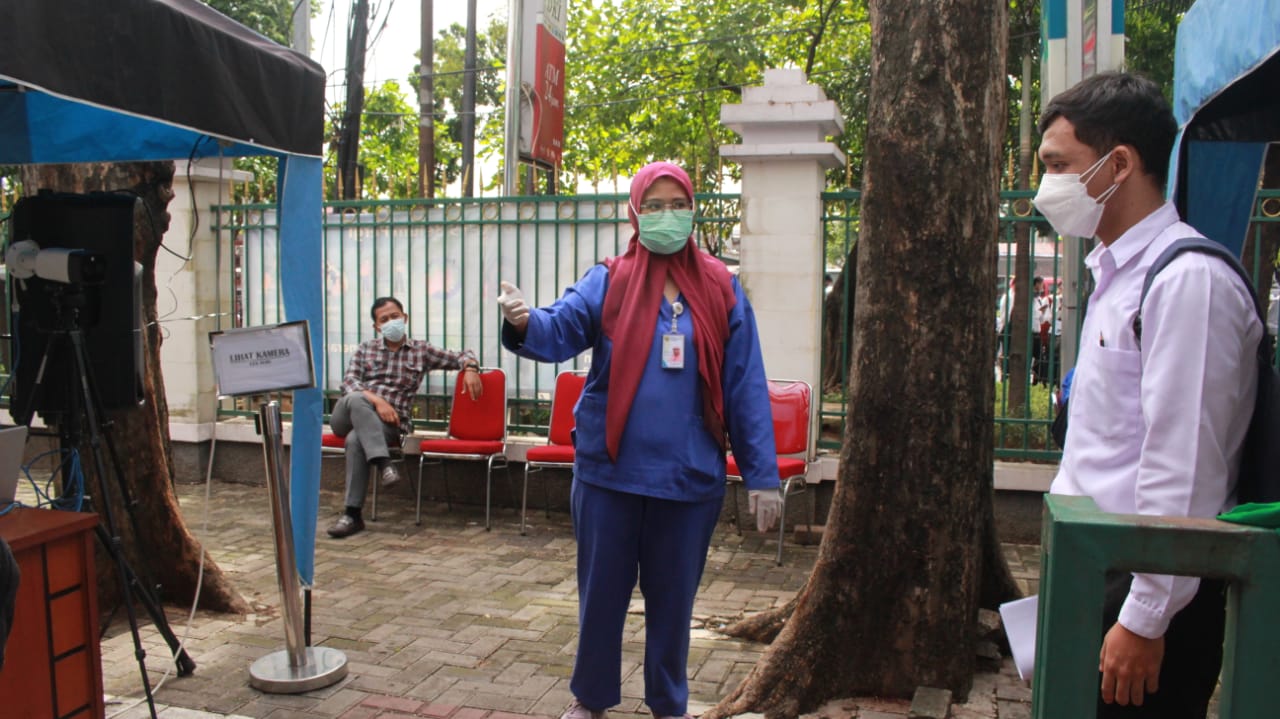 Ujian seleksi kompetensi bidang dilaksanakan dengan menerapkan protokol kesehatan yang sangat ketat, dimulai dengan cek suhu, mencuci tangan, menjaga jarak dan memakai masker. (Humas)