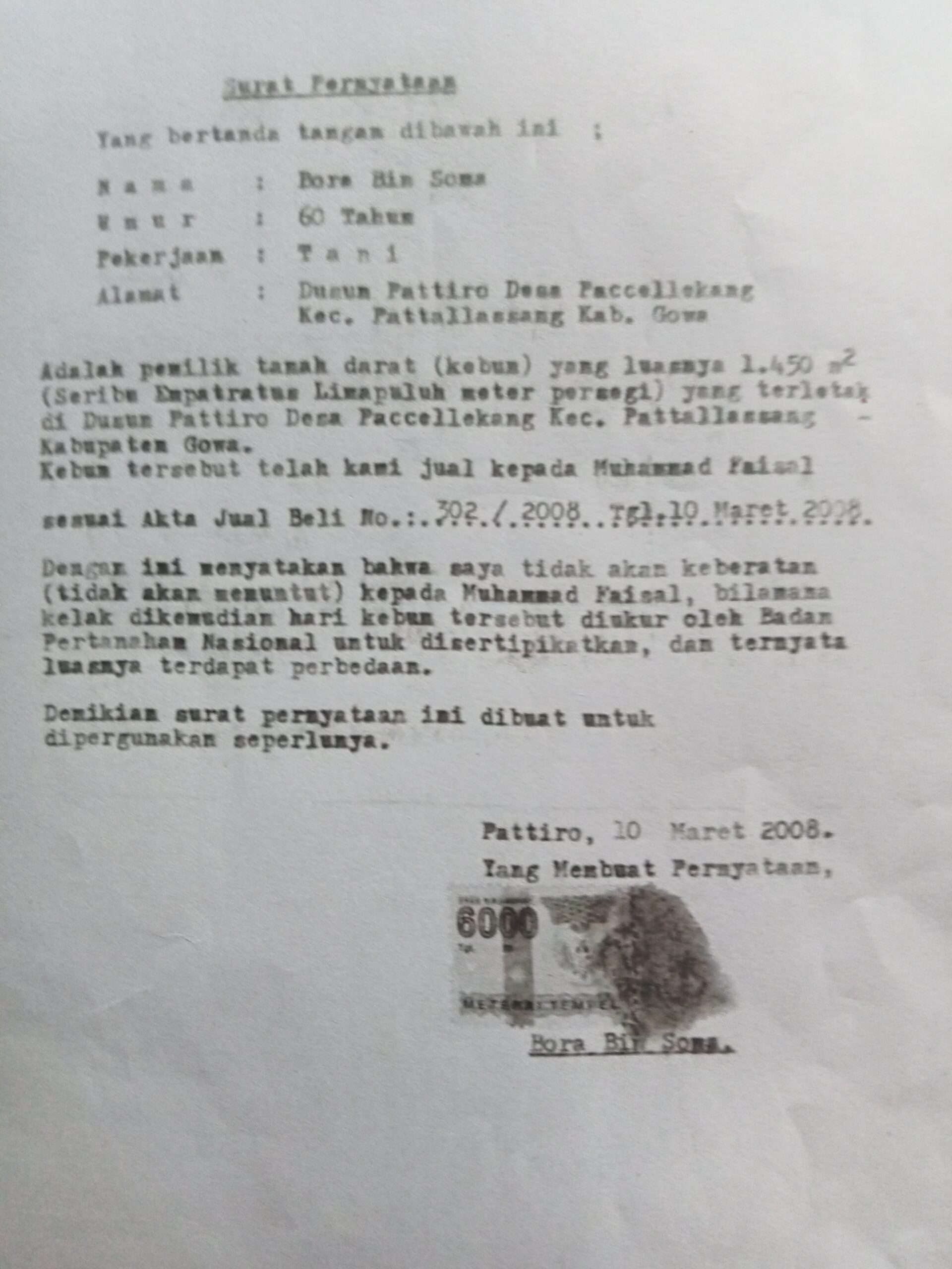 maka kami dari ahli waris keberatan dengan apa yg dilakukan saudara Muhammad faisal kami menduga pernyataan tsb palsu dan cacak hukum dimana sudah jelas didalam AJB sudah tertuang luas lokasi yg mereka beli dari bapak almarhum bora dg takko seluas 14.50m2 setelah diadakan pengukuran dari pihak ahli waris lokasi tsb seluas 1700m2