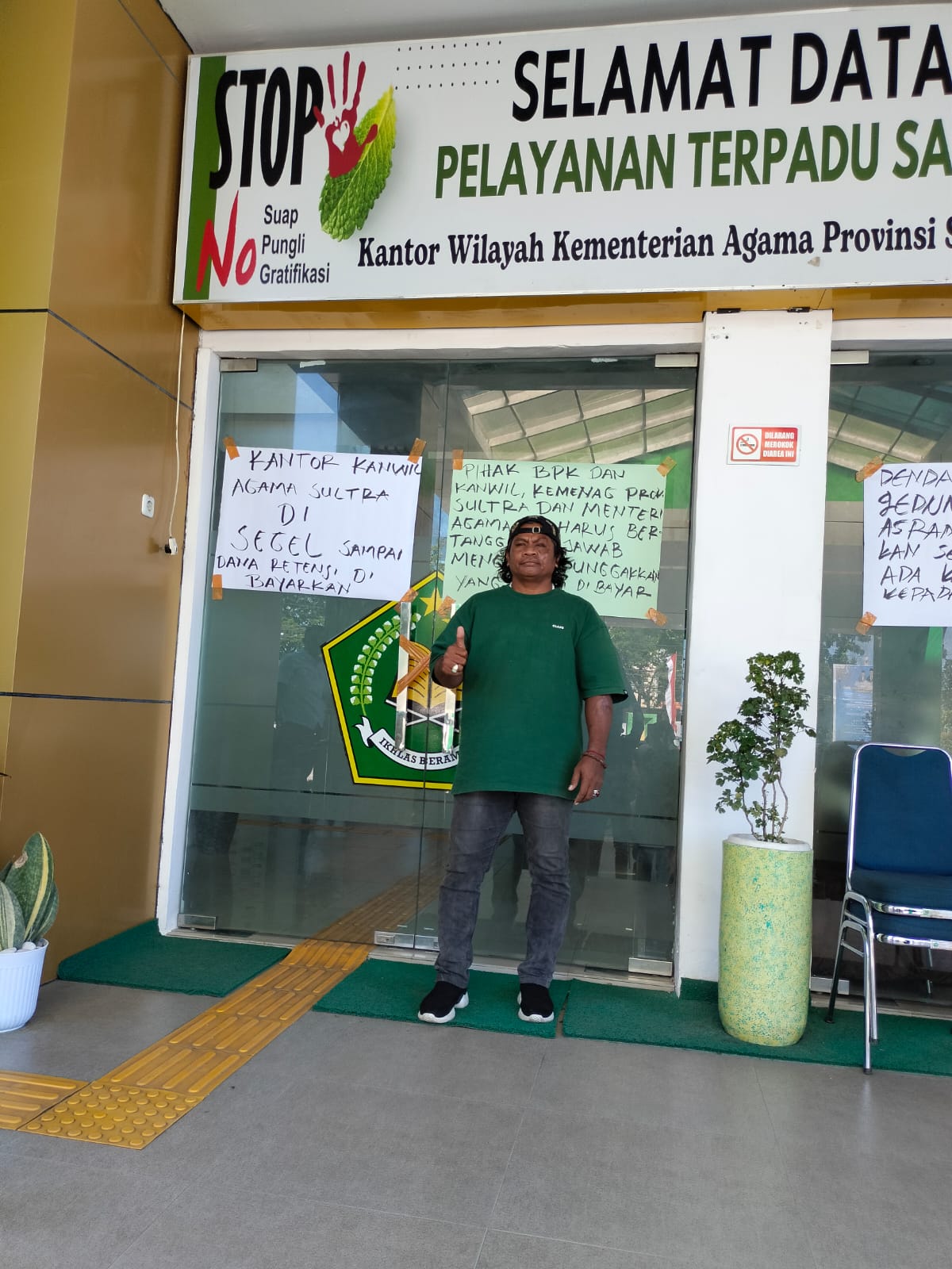 Dalam aksi tersebut, mereka langsung menyegel kantor Kanwil Kemenag Sultra. Aksi tersebut menyoal proyek pembangunan Gedung Aula Asrama Haji Kota Kendari yang telah selesai pada awal April 2022, namun uang retensi yang menjadi hak kontraktor belum dibayarkan hingga saat ini.