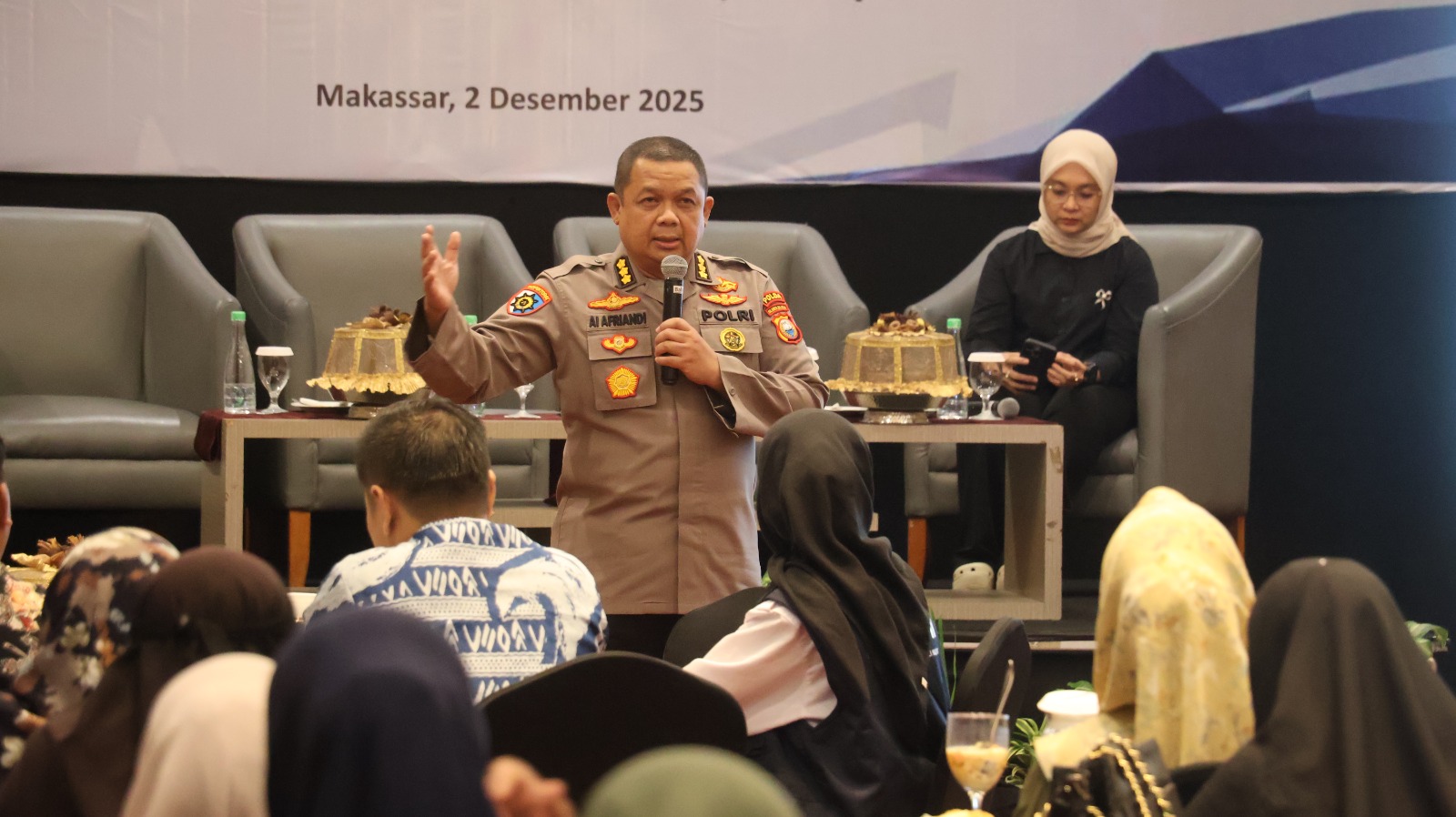 FGD ini menghadirkan sejumlah narasumber kompeten, di antaranya Prof. Dr. Nur Haedar Jafar, S.Pt., M.Kes (Pakar Gizi FKM Unhas), Hariani Jompa, SKM., M.Kes (Ahli Gizi Dinas Kesehatan Provinsi Sulsel), Kombes Pol. Ai Afriandi, S.H., S.I.K., M.M (Irwasda Polda Sulsel), serta Dr. dr. Muji Iswanty, S.H., M.H, Sp.DVE, Subsp.Ven, M.Kes, CMed selaku moderator.