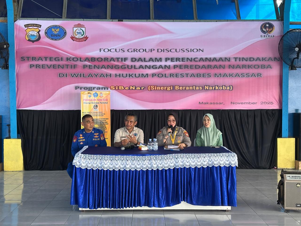 Makassar – Dalam rangka memperkuat sinergi dan kolaborasi lintas instansi serta elemen masyarakat dalam upaya pencegahan dan penanggulangan peredaran narkoba di Kota Makassar, Polrestabes Makassar melaksanakan Focus Group Discussion (FGD) Program SIBENAR (Sinergi Berantas Narkoba) pada hari Selasa, (11/11/2025), bertempat di Aula Dirpolairud Polda Sulawesi Selatan.