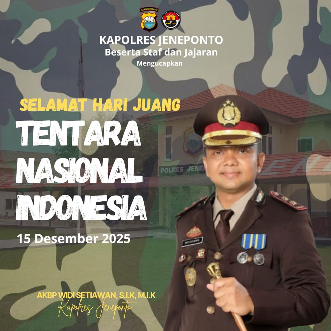 Jeneponto, 15 Desember 2025 – Memperingati Hari Juang TNI Angkatan Darat (TNI AD) tahun 2025, Kapolres Jeneponto AKBP Widi Setiawan, S.I.K., M.I.K., turut menyampaikan ucapan selamat. Ucapan tersebut disebarluaskan melalui beberapa akun media sosial pada hari Senin (15/12/2025).