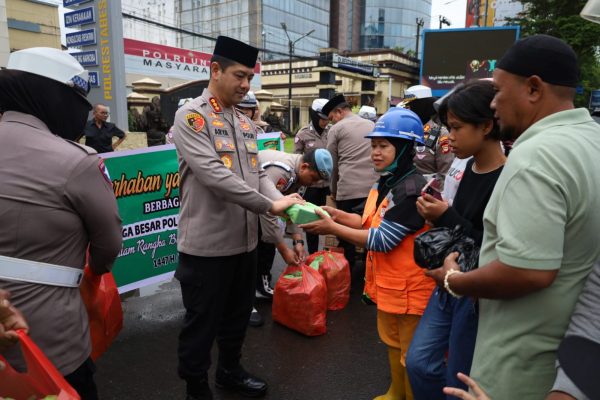 Makassar- Di bulan suci Ramadhan 1447 Hijriah yang penuh berkah, Kapolrestabes Makassar Kombes Pol Arya Perdana, SH,SIK,M.Si berbagi takjil kepada masyarakat pengguna jalan menjelang berbuka puasa di depan Mapolrestabes Makassar Jalan Ahmad Yani, Selasa (24/02/2026)