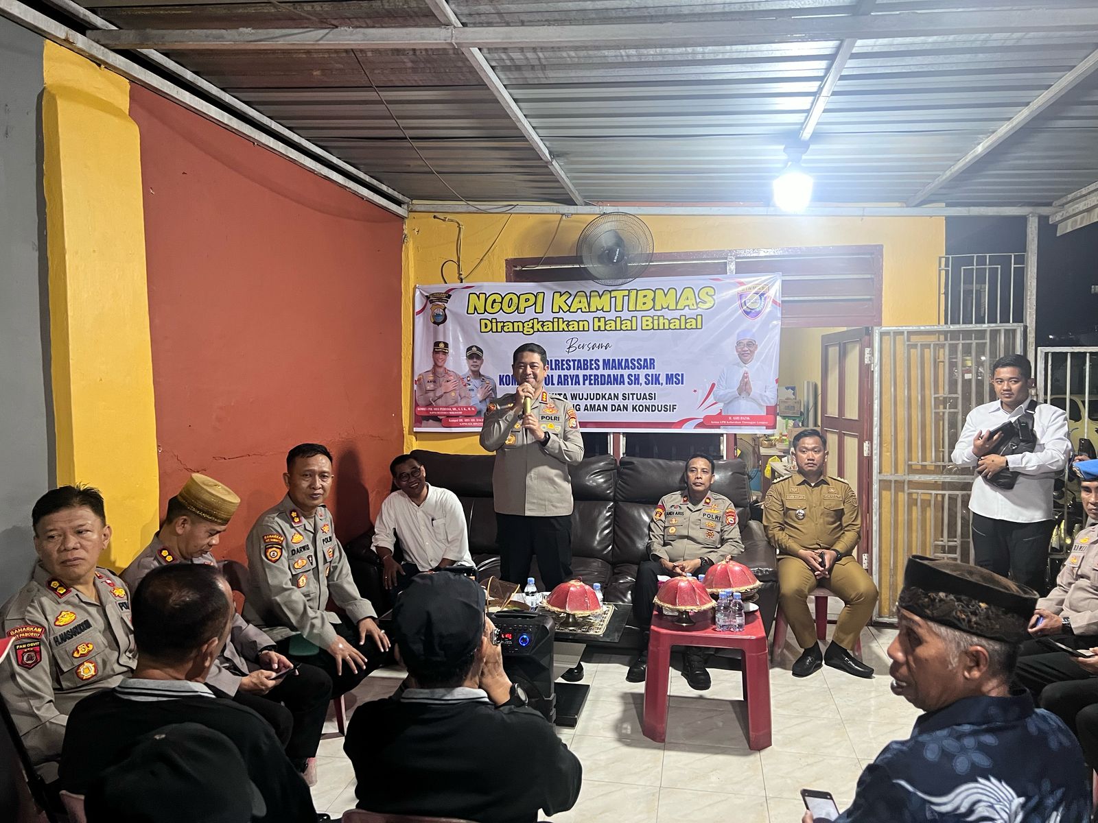 Makassar – Kapolrestabes Makassar Kombes Pol Arya Perdana SH, SIK, M.Si menggelar kegiatan Ngopi Kamtibmas di Balai FKPM/LPM Jalan. Langgau, Kelurahan Timung Lompoa, Kecamatan Bontoala Kota Makassar pada Senin (14/0/2025) malam.