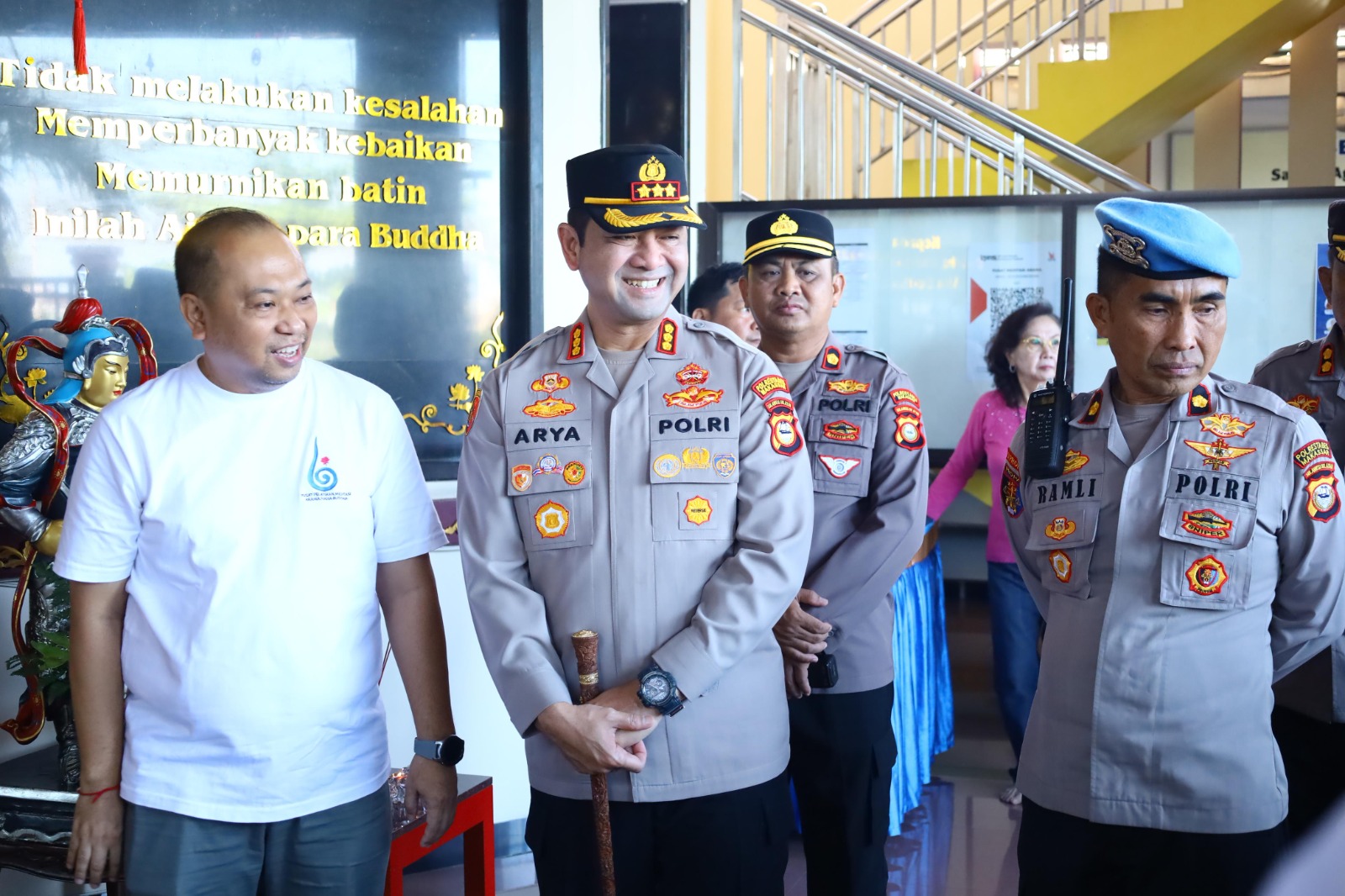 Kapolrestabes tiba di Vihara Sasana Dhiva yang terletak di Jalan Sungai Poso No. 47, Kelurahan Pisang Utara, Kecamatan Ujung Pandang, Kota Makassar disambut langsung oleh Ketua Vihara Sasana Dhiva, Bapak Yongris Darwis.