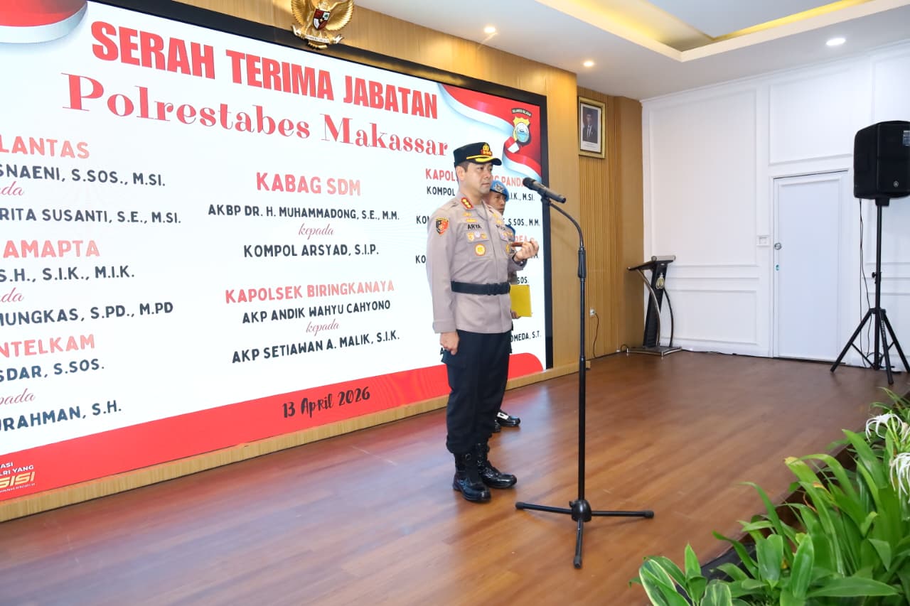 Makassar – Kapolrestabes Makassar, Kombes Pol Arya Perdana, SH., SIK., M.Si memimpin upacara serah terima jabatan (sertijab) sejumlah pejabat utama dan kapolsek jajaran di Aula Mappaoddang Polrestabes Makassar, Senin (13/6/2026).