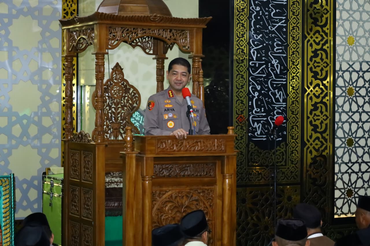 Dalam kesempatan tersebut, Kombes Pol Arya Perdana, SH, SIK, M.Si menyampaikan pesan-pesan kamtibmas kepada jamaah.