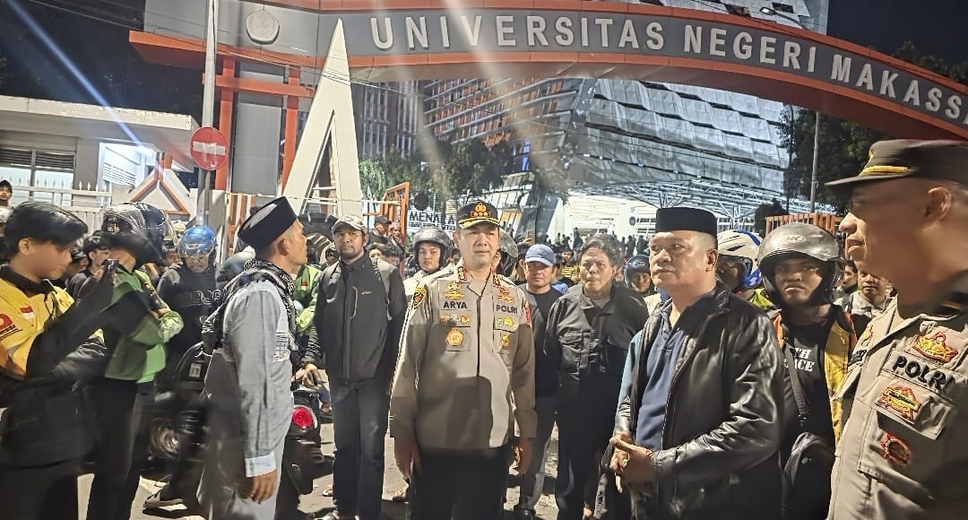 Makassar – Kapolrestabes Makassar Kombes Pol Arya Perdana, SH., S.I.K., M.Si., turun langsung melakukan pengamanan terjadinya bentrokan antara mahasiswa yang melakukan aksi unras dan pengemudi ojek online (ojol) di Kampus Universitas Negeri Makassar (UNM), Jalan AP Pettarani, Kota Makassar, Kamis (5/3/2026).