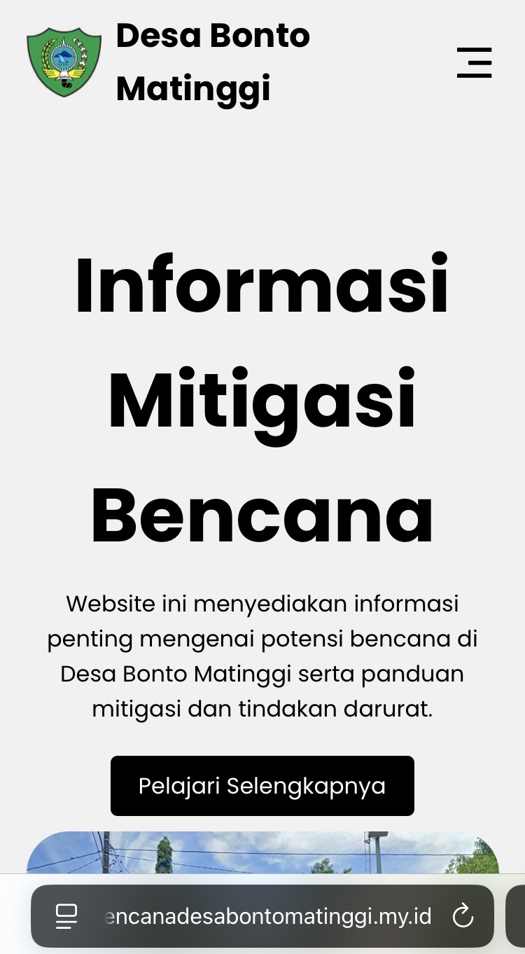 Website mitigasi bencana Desa Bonto Matinggi ini dapat diakses melalui tautan : https://pemdesabontomatinggi.github.io/_mitigasibencanadesabontomatinggi/