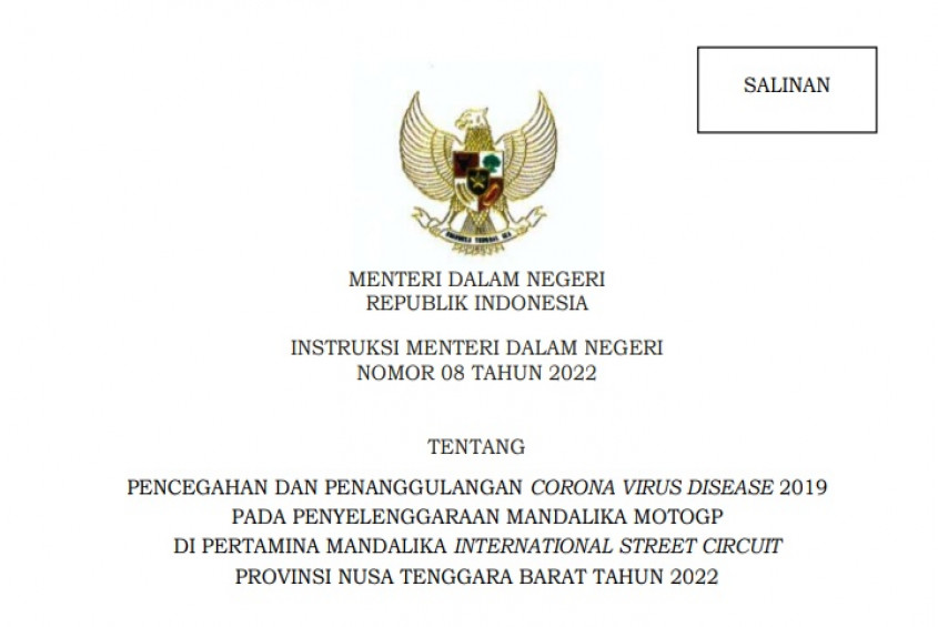 Lensa-Rakyat.Com, Jakarta – Menteri Dalam Negeri (Mendagri) Muhammad Tito Karnavian menerbitkan Instruksi Mendagri (Inmendagri) Nomor 08 Tahun 2022 tentang Pencegahan dan Penanggulangan Corona Virus Disease 2019 pada Penyelenggaraan Mandalika MotoGP di Pertamina Mandalika International Street Circuit, Nusa Tenggara Barat Tahun 2022.