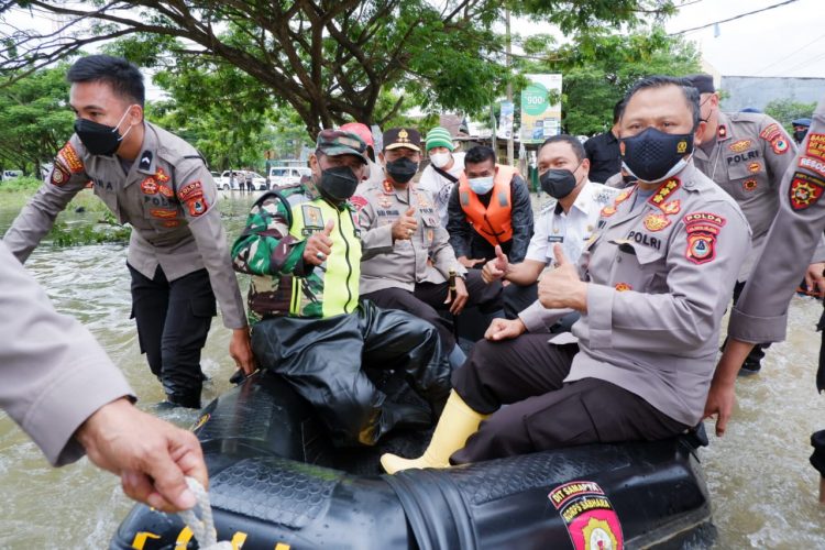 Selanjutnya, dengan menaiki perahu karet Kapolda Sulsel bersama PJU Polda Sulsel secara langsung memantau rumah warga yang terdampak banjir.