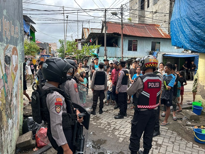 MAKASSAR – Personel Samapta Polrestabes Makassar yang dipimpin Kasat Samapta Kompol Justian, S.H., S.I.K., M.I.K. mendatangi lokasi terjadinya tawuran di Jalan Tinumbu Lorong 148. Kecamatan Bontoala Kota Makassar, Jumat (21/11/2025).