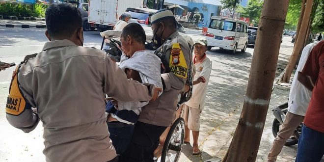 Adapun Bhabinkamtibmas Polsek Ujung Pandang Polrestabes Makassar, yakni Aiptu Bahar Sampe, S.Pd,. bersama Aipda Jonas Bumbungan, SH,. membantu salah seorang warga yang tiba-tiba terjatuh setelah menabrak trotoar di Jalan Botolempangan, tepatnya didepan Kantor PT. Taspen Kota Makassar, Rabu, (26/1/22).