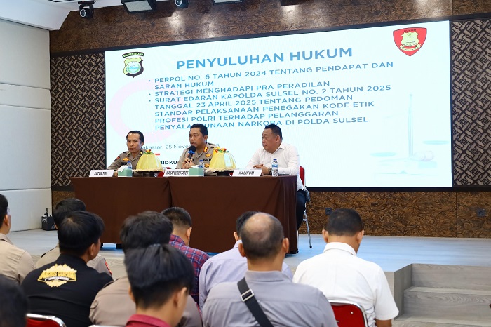 Makassar – Bidang Hukum (Bidkum) Polda Sulawesi Selatan melaksanakan sosialisasi Peraturan Kapolri (Perkap) Nomor 6 Tahun 2024 tentang Pendapat dan Saran Hukum, di Aula lantai 2 Kantor Hasamitra, Jalan Ahmad Yani, Makassar, Selasa (25/11/2025).
